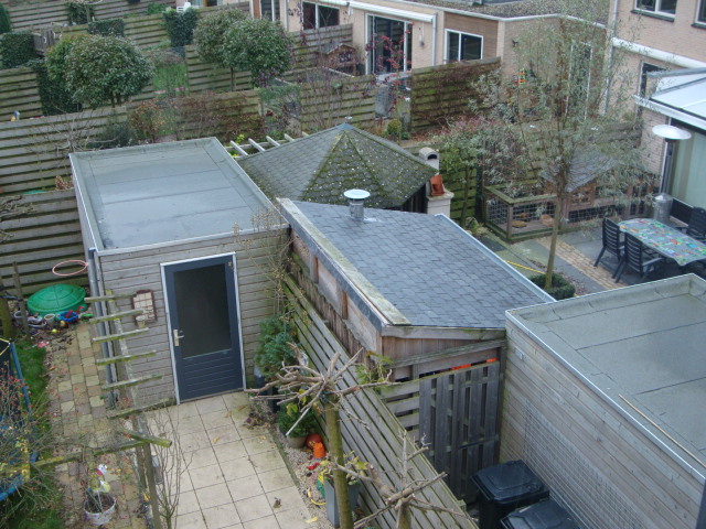 Links onze vierkante schuur door bouwer bij nieuwbouw geplaatst. Rechts de schuur en het houten prieel van de buurman. Onze grond loopt langs onze schuur aan de rechterkant. Zoals je kunt zien staat de schutting nu recht, maar had schuin kunnen lopen langs de schuur af. Wonen nu 7.5 jaar in dit huis, schutting staat er 7 jaar.Wij hebben geen toestemming gegeven voor het bouwen van dit prieel en het gebruiken van onze grond. Ik kan nu ook niet voor onderhoud bij mijn schuur.