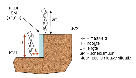 Wat is de wettelijke maximale hoogte (H) voor een haag of schutting die tegen de scheidsmuur worden geplaatst (zie bijlage figuur 2) indien er een hoogte verschil zit tussen het maaiveld van de ene eigenaar (MV1) t.o.v. zijn buren (MV2)? En is de wettelijke minimale afstand (L) van 50cm ook van toepassing tussen een haag en een scheidsmuur?