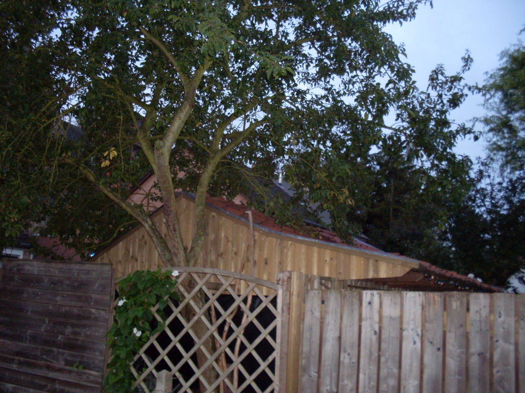 de buren hebben een pruimenboom, kort bij de schutting staan.
