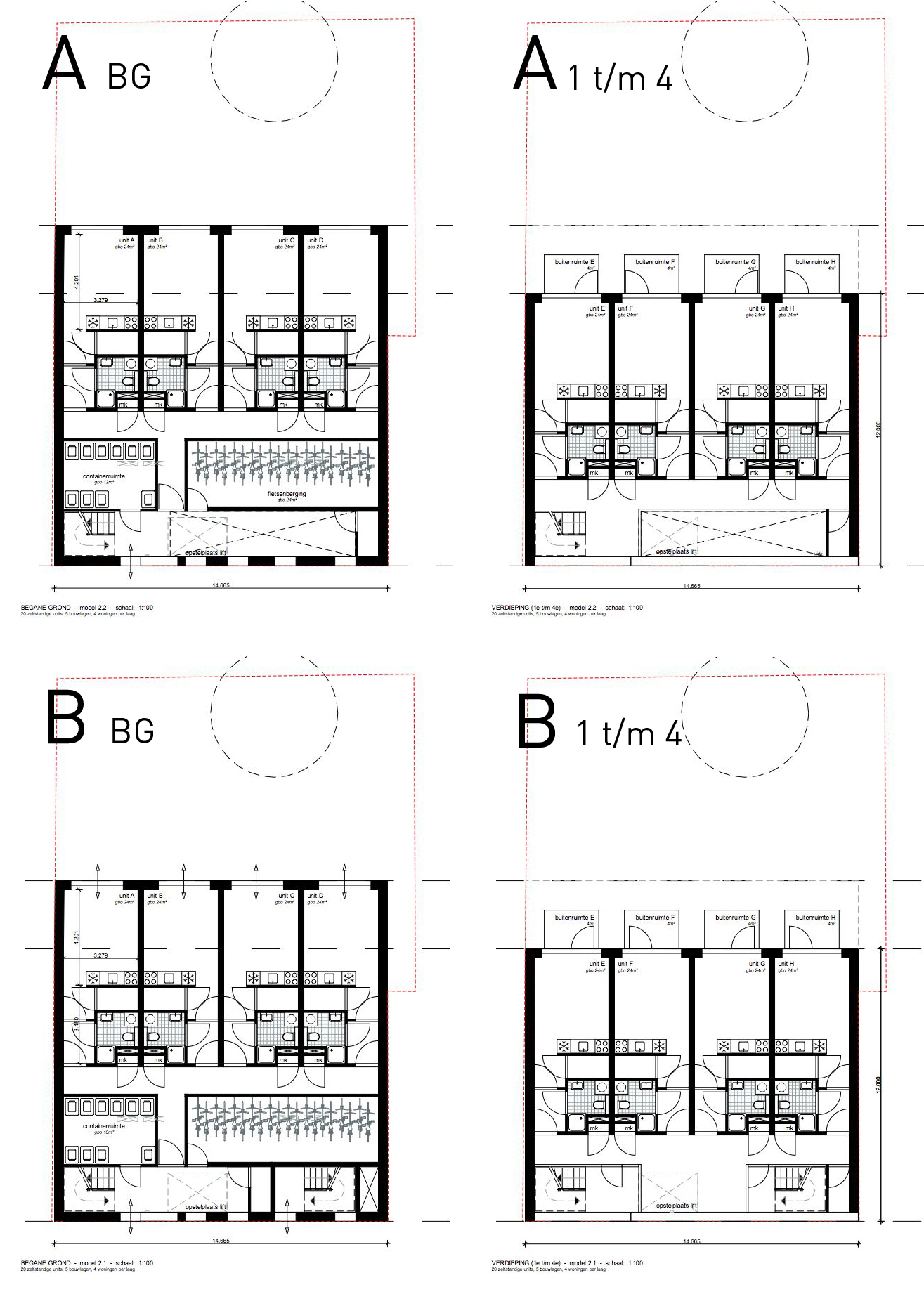 Kan er bij dit project volstaan worden met 1 veiligheidstrappenhuis (A) of moet er een extra vluchttrap (B) aangebracht worden?