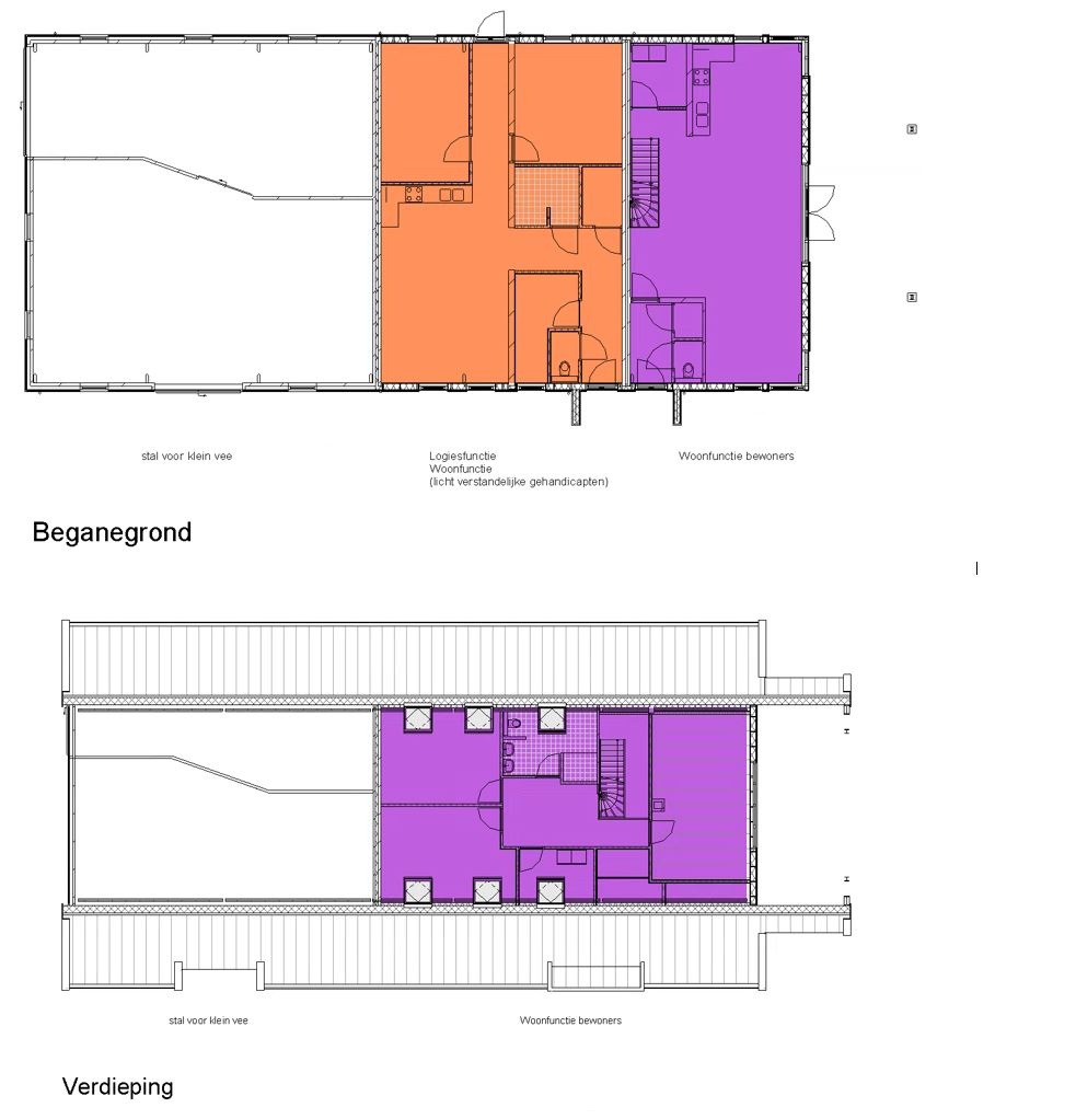 Voor een project ben ik bezig om een woning/stal te ontwerpen met een logiesfunctie voor licht verstandelijke gehandicapten(of kan dit ook onder woonfunctie vallen). Een woonfunctie voor de bewoners (bgg-verd.) en een stal voor klein vee. Hoe kan dit worden verdeeld? En hoe kan ik omgaan met de EPC/ventilatie/Daglicht/brandcompartimentering?