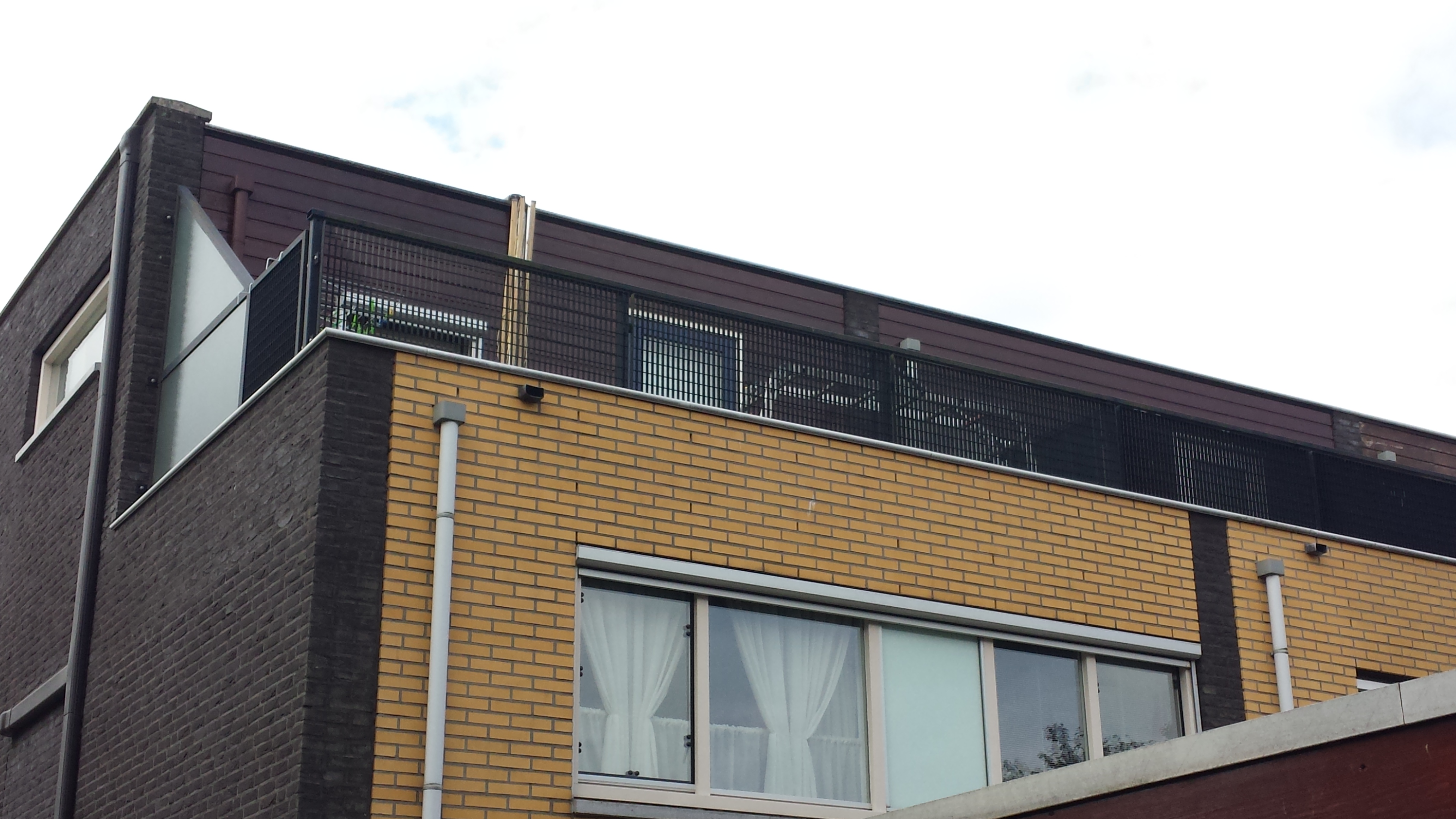 De zijmuren zijn van zwarte stenen en voor en achtergevel van gele stenen,de achtergevel van de "zolder"op het dakterras is van hout, de buren zouden graag vanwege het licht, gele stenen aan hun kant van de muur willen, echter de uitbouwen die er al staan hebben zwarte stenen en staan wel geheel op de tussenmuur met buren.