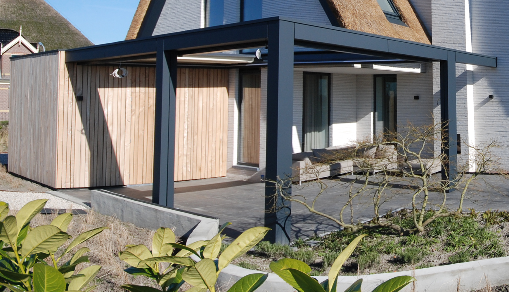 2) een 'pergola' met daarin een beweegbaar zonnescherm. Deze 'pergola' bestaat uit een staalconstructie die gefundeerd is op onderheide poeren en bekleed zijn met aluminium panelen.