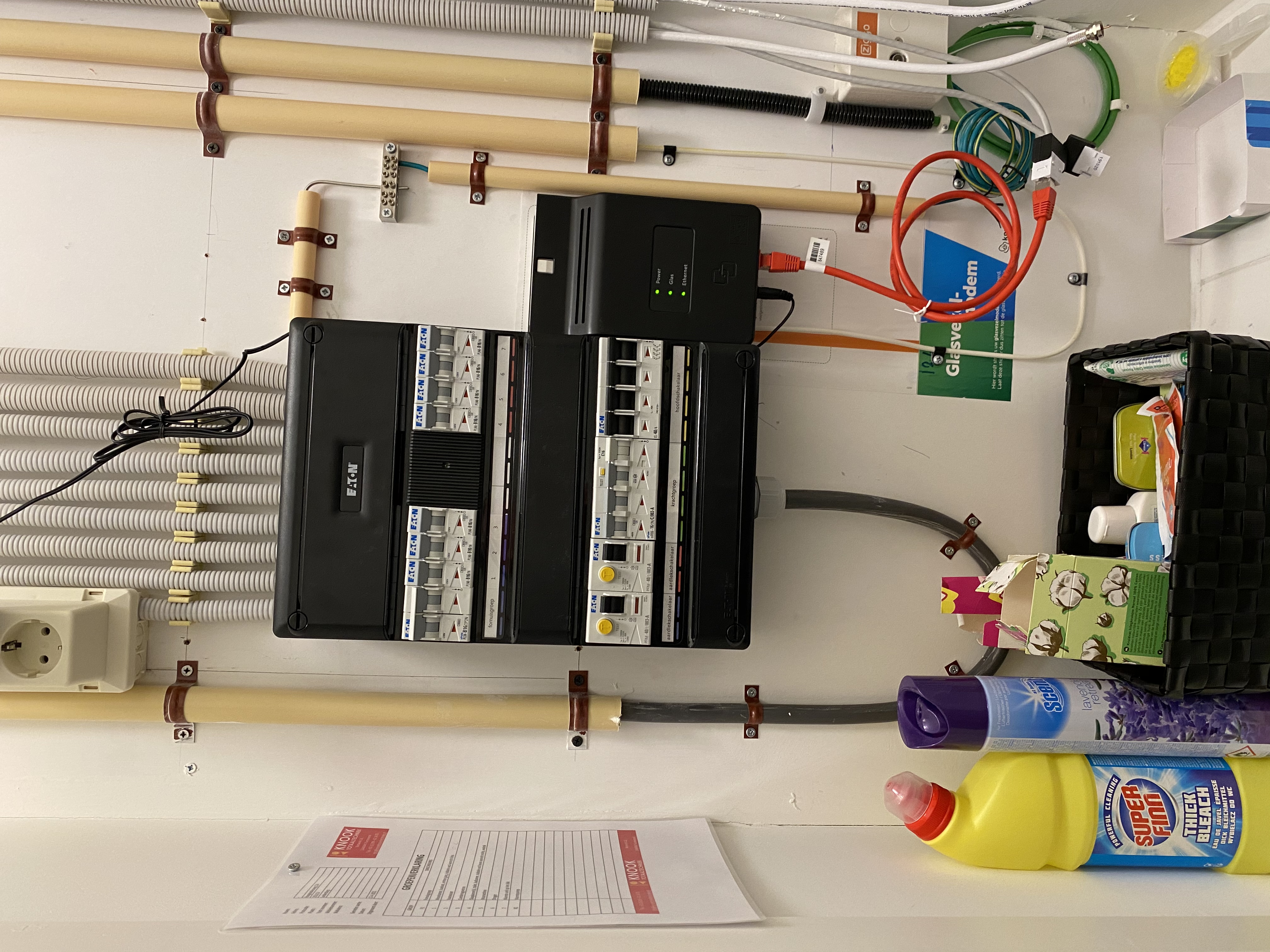 Op de foto oogt het nog wel zeer recent in ieder geval. Voor meterruimtes gelden natuurlijk eisen, of dat voor dergelijke installaties ook geldt durf ik eigenlijk niet te zeggen. Dan moet je waarschijnlijk ergens in een NEN-norm gaan lopen spitten. Rare oplossing? Absoluut. Maar of het verboden is, ik vraag het me af. Even naïef gesteld zou je zeggen dat als het echt niet mocht, de installateur het nooit zo zou maken. Maar dat is in de bouwsector niet altijd een garantie helaas.