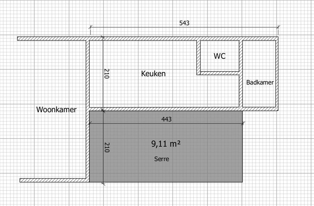 Wij hebben een woning uit 1940 en heeft een achter aanbouw van 543cm diep x 210cm breed waar de keuken, wc en badkamer is gesitueerd.