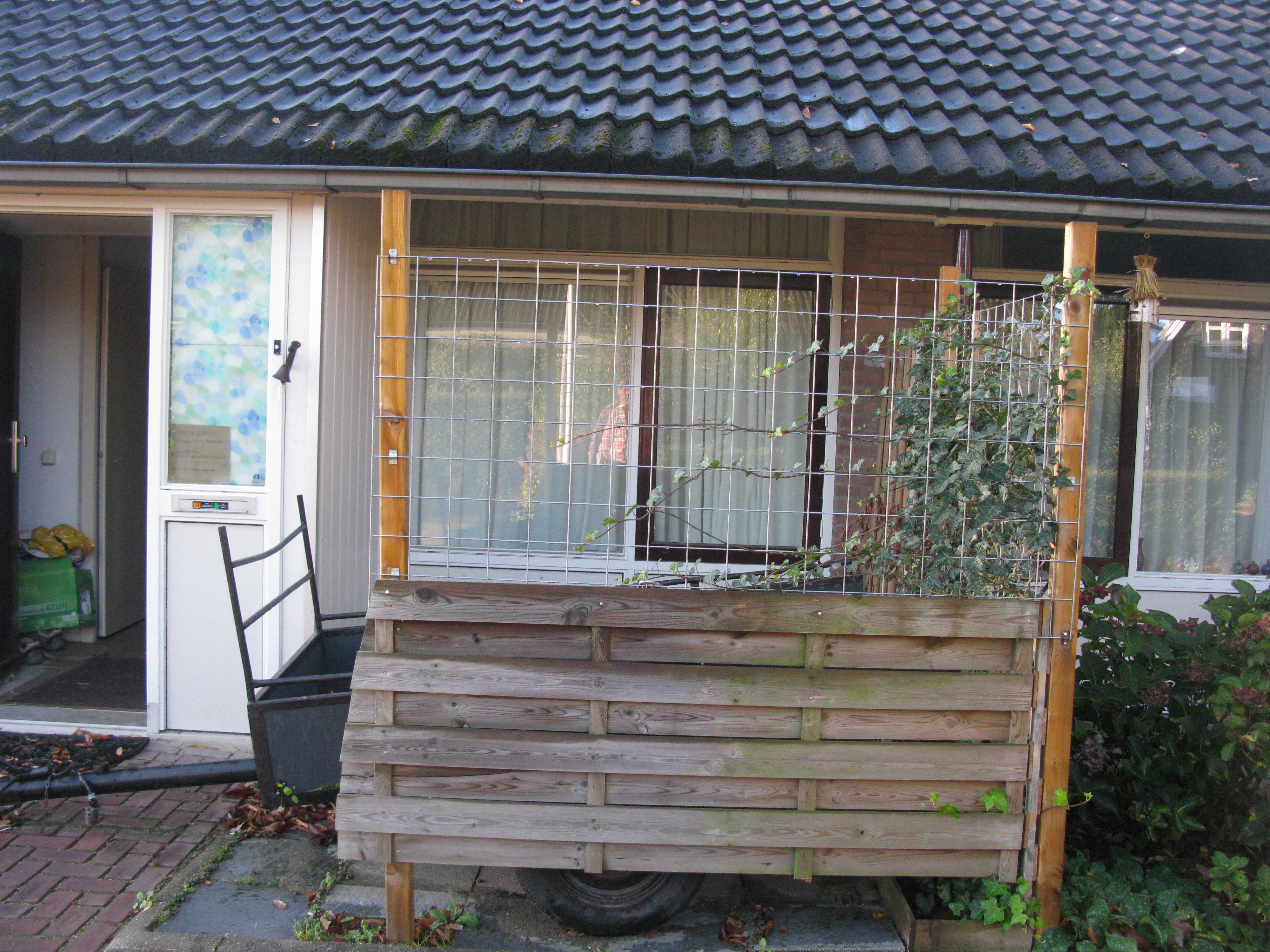 Ik heb een schutting van 1 meter met een gaaspaneel en klimop.