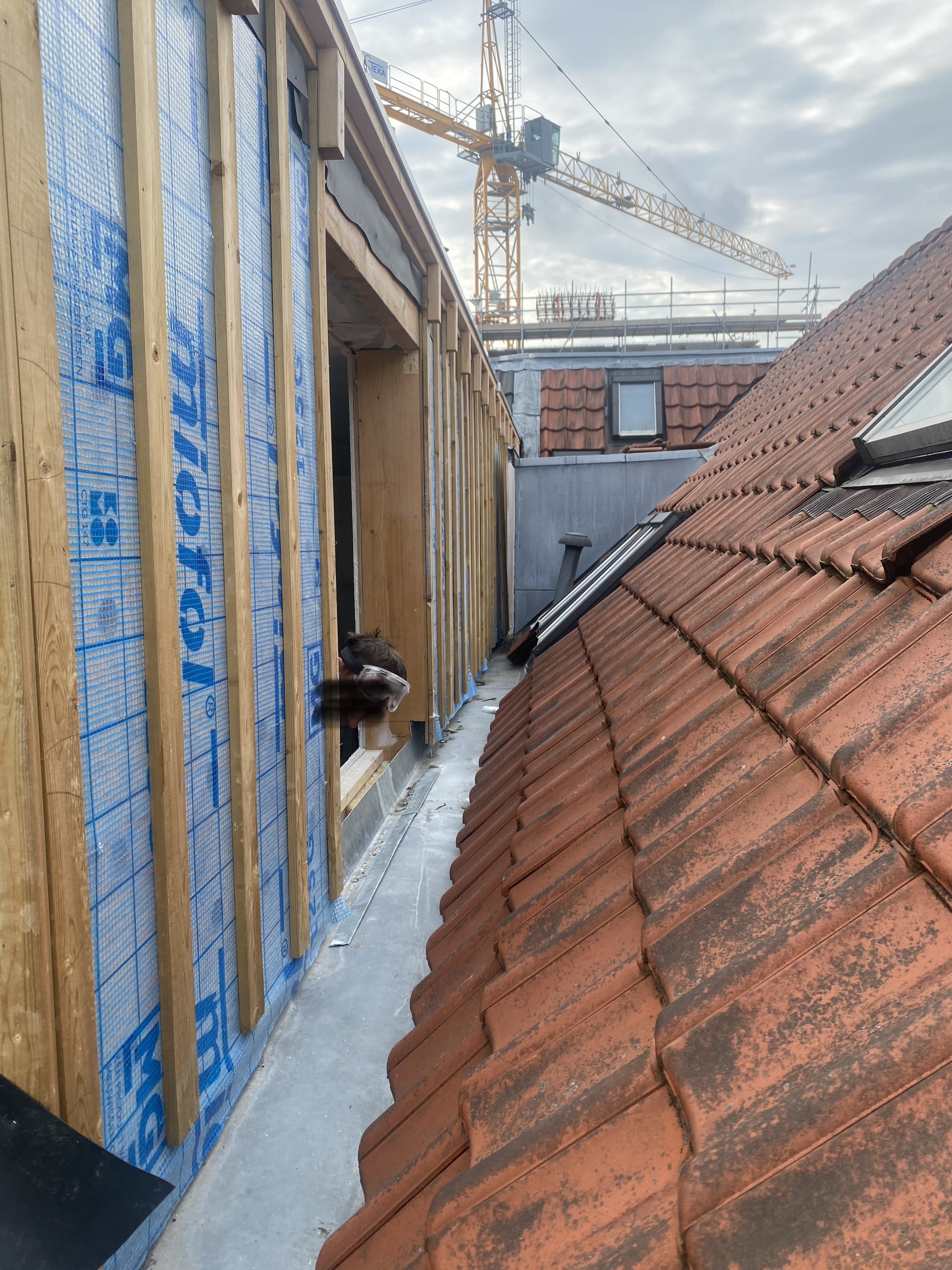 waarna je het dak van de dakkapel aansluit on de muur van de buren