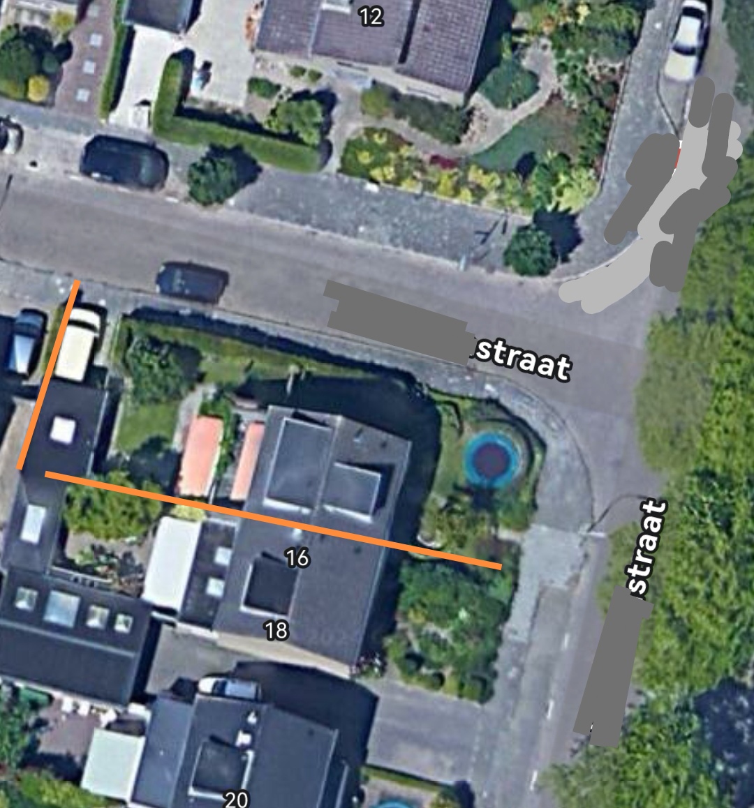 Ons 2-onder-1-kap huis staat op de hoek van een t-splitsing. De zijgevel is in lijn met de voorgevel rooilijn van de buren in de zijstraat.