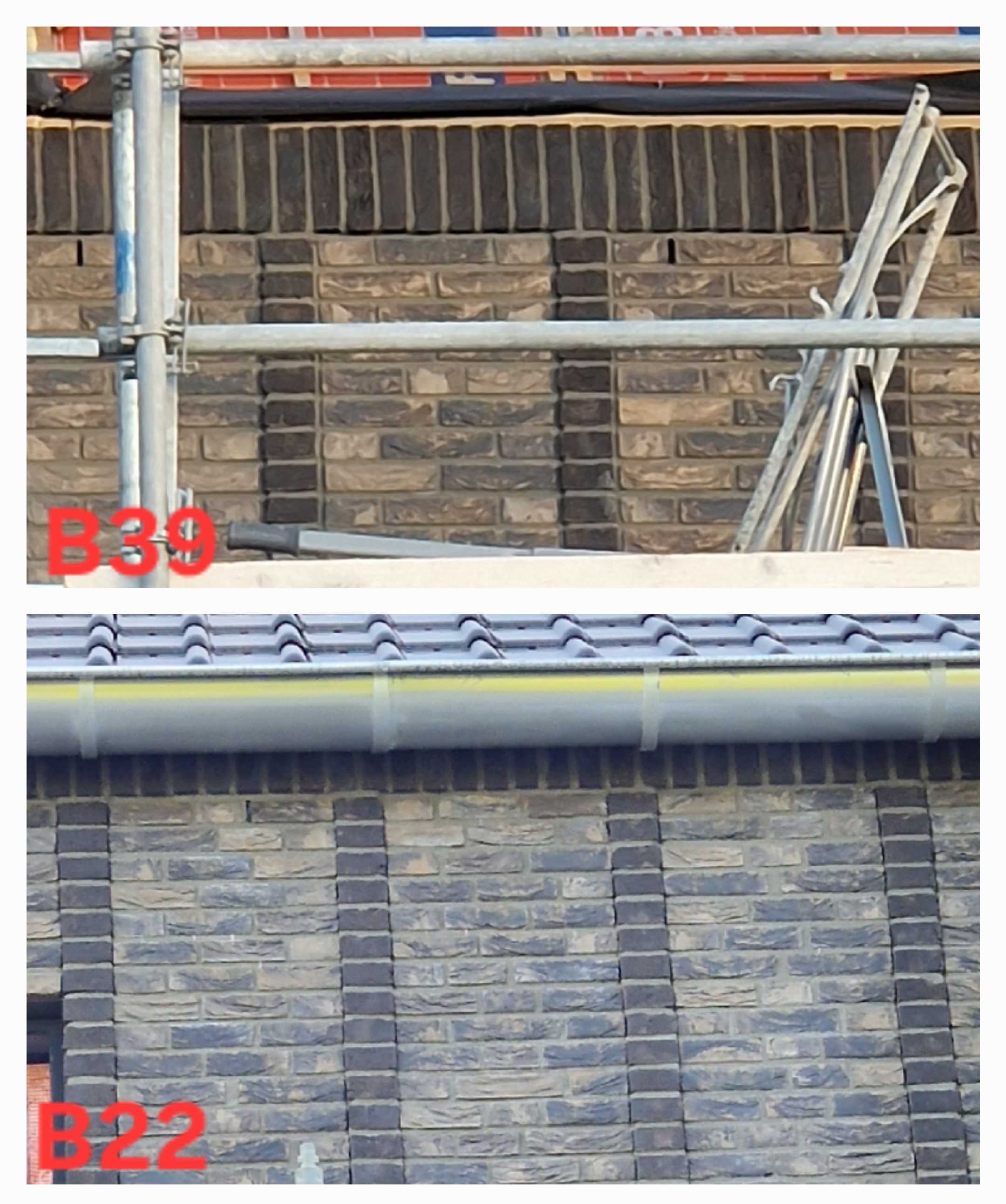 Momenteel is onze nieuwbouwwoning in aanbouw. We hebben een verschil opgemerkt in het voegwerk van onze woning, vergeleken met diverse andere woningen in het project. In onze woning (B22) zijn verticale kieren zichtbaar tussen de bruine muren en zwarte accentlijnen; bij andere woningen zijn die aansluitingen gevoegd.